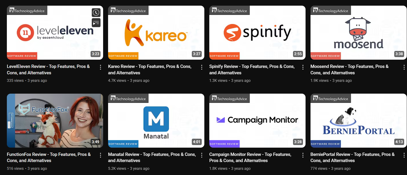Old thumbnails from videos. TechnologyAdvice’s YouTube always consisted of simple thumbnails using the logo of the software discussed except for Project-Management.com videos which always used a picture of the host.
